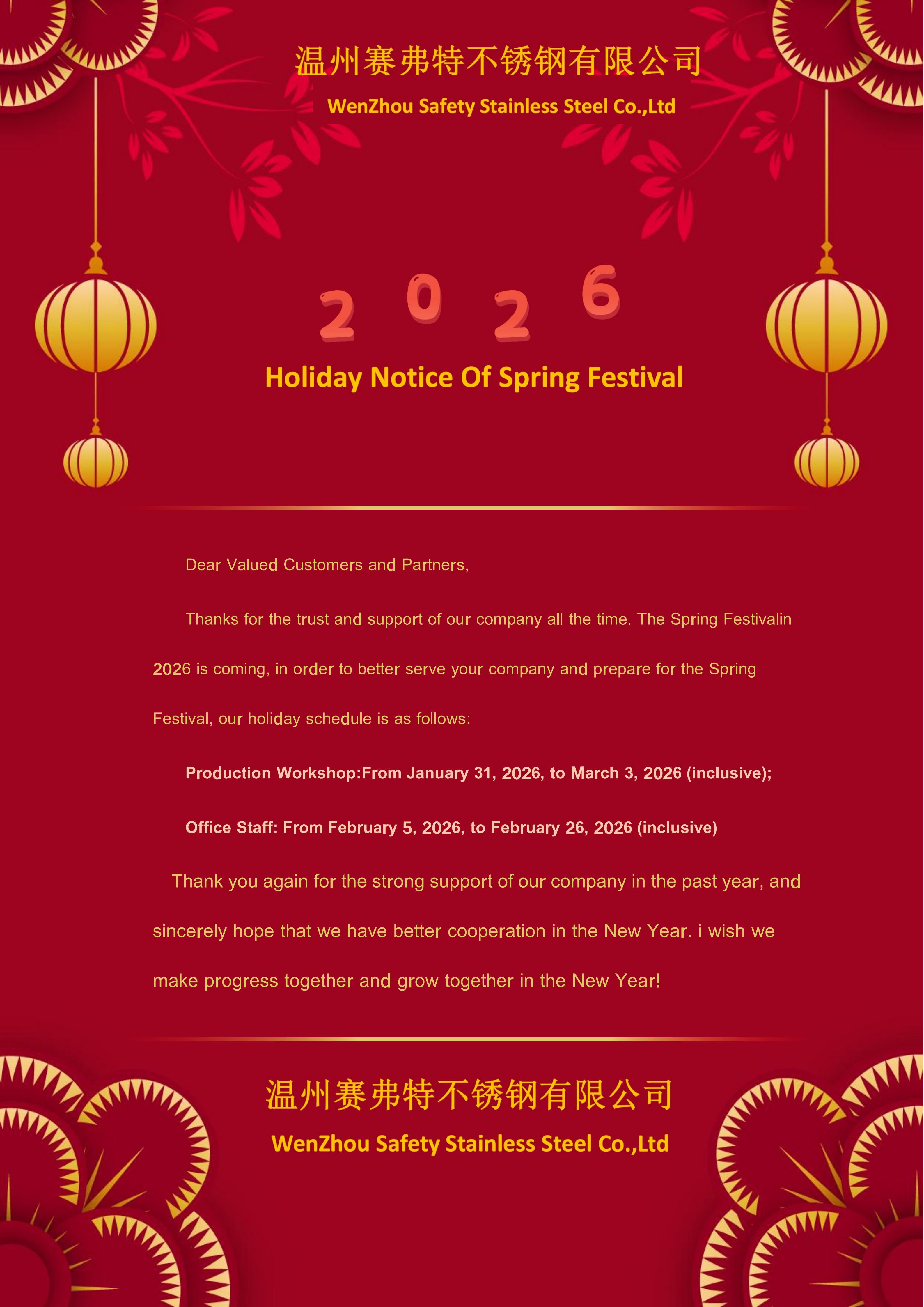 This is to inform you that WenZhou Safety Stainless Steel Co., Ltd. will be observing the Chinese New Year holiday. The holiday schedule for our different departments is as follows: